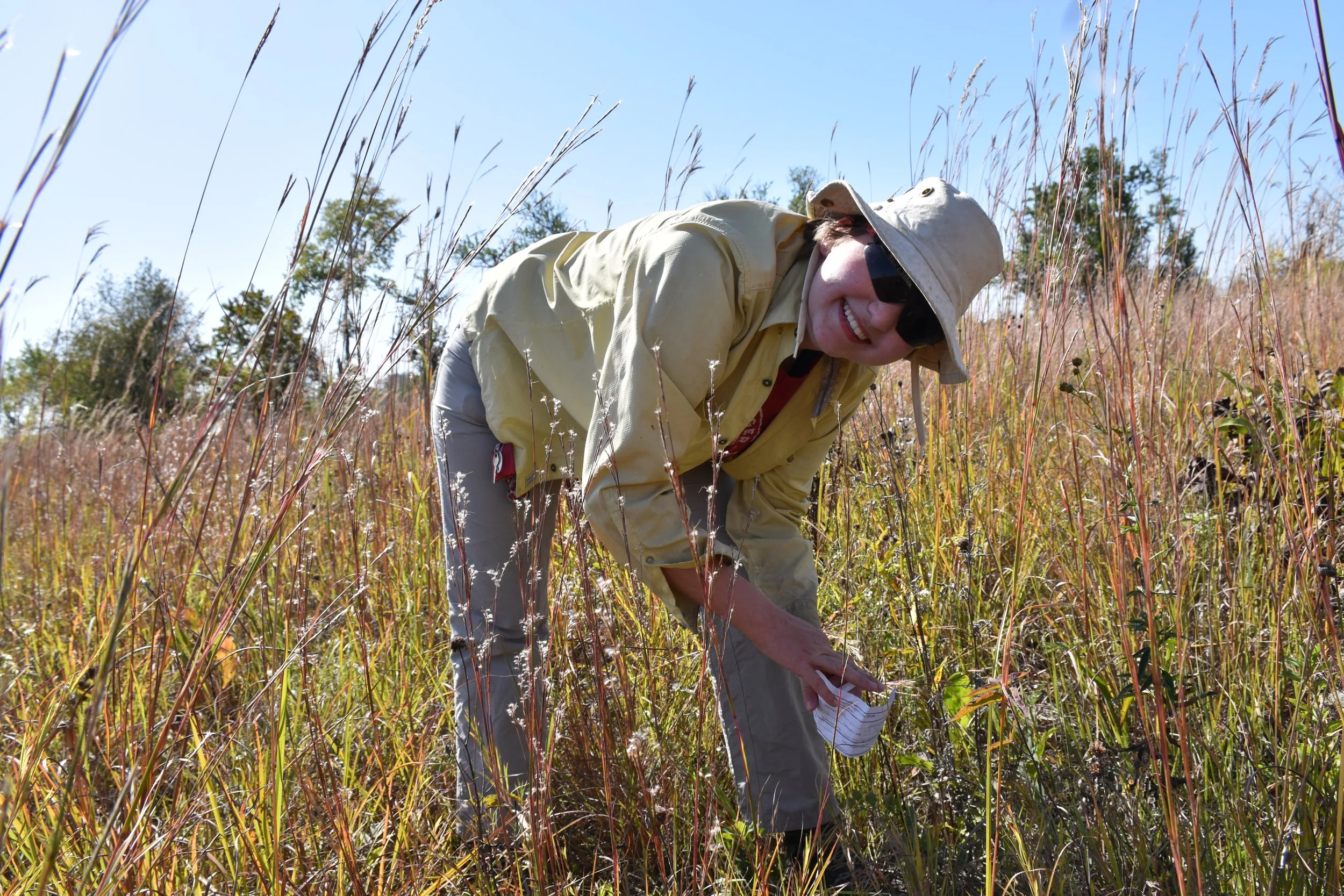 We spent time spreading a seed called Blue Eyed Grass (Sisyrinchium campestre). It is a gorgeous little plant that looks like a grass but is actually part of the Iris family! This species blooms in May-July, before most others, making it an important plant for early pollinators. Because of its small stature, it needs openings in the plant communities from either soil disturbance (bison, gophers, badgers, etc) or fire.